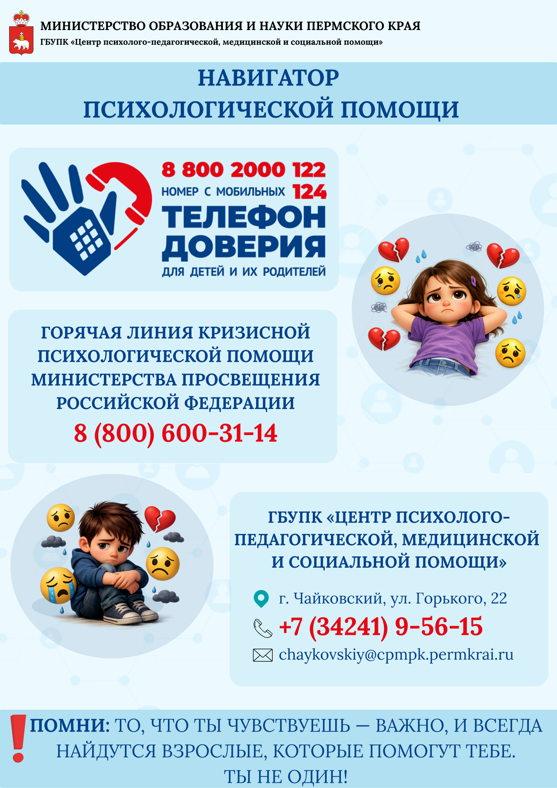 Министерство образования и науки Пермского края – ежедневно, с 9.30 до 17.00 (обеденный перерыв с 12.00 до 13.00 ч.) по телефонам: 217-79-49, 217-78-89, 217-79-31;